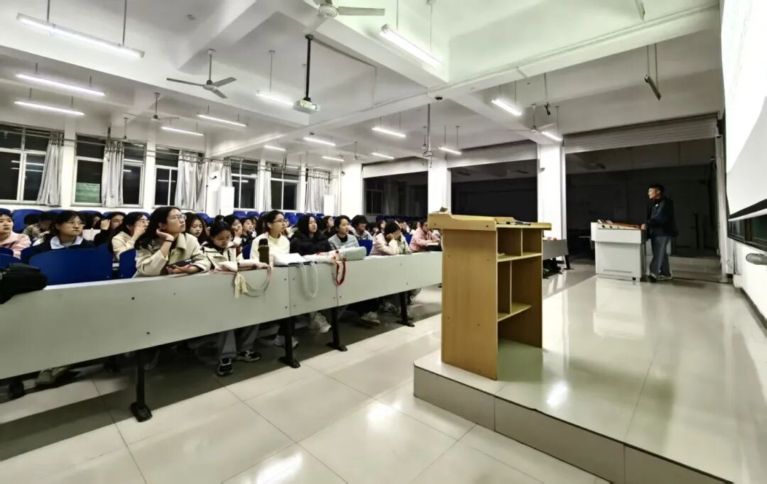 在互动答疑阶段,针对同学们普遍关心的“学业与备考时间协调”“听力关键信息抓取”以及“写作逻辑结构搭建”等问题,胡安乐结合实例进行了细致分析,并推荐了实用的备考平台与听力辅助工具。他强调,专四备考贵在长期坚持与持续积累,唯有专注投入、持之以恒,才能切实提升语言综合运用能力。