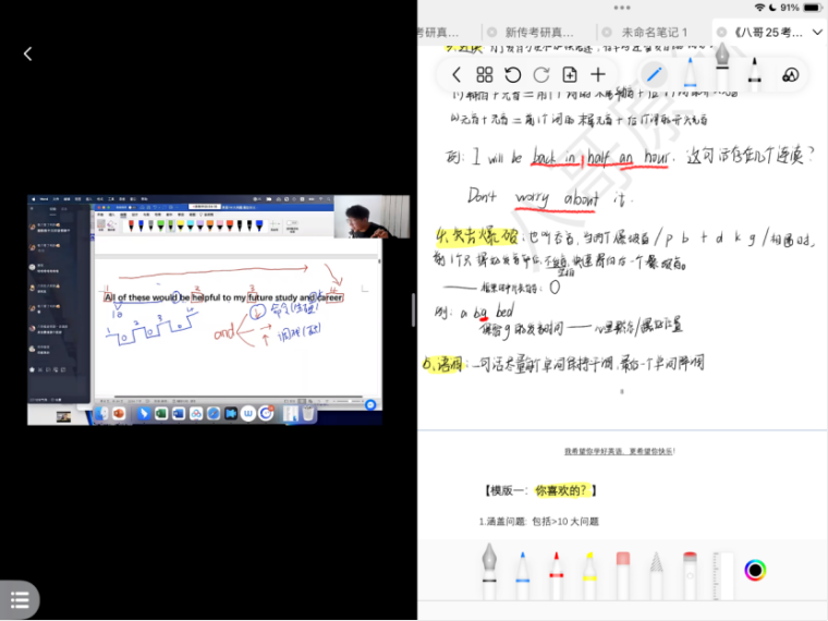(1)单词首先,单词永远都不怕早,而且每天都要背,循环背,纸质和软件都可以,我前期是两个都背,后期背的快了就把纸质的抛了。(2)阅读我属于英语基础比较差的那种,只过了四级,所以3-4月还在看语法课,看的是刘晓艳的。看完语法课就可以开始练题了,不要觉得单词没背完一轮就不能开阅读,阅读题也是需要坚持刷的。可以配合唐迟的阅读课,每天坚持写阅读题,然后根据老师方法论的思路复盘错题。我复盘是坚持会把整篇阅读从头到尾翻译一遍,把文章意思搞懂搞透,然后再去看正确答案对应的地方在哪,错是错在哪了,同时不会的单词标注出来回头专门去背。(3)翻译翻译我听的唐静。重要的还是词汇量,这个需要长时间的积累。老师教的主要还是技巧和抓分点,跟着老师练的同时可以记下笔记,能够让自己在学习和做题时逻辑更加清晰。(4)七选五七选五我看的颉斌斌,如果后期时间紧张的话可以只看技巧课就下手练题了,不要为了听课占用太多刷题的时间,输出比输入重要。(5)作文作文我听了一点石雷鹏,如果是水区的话背石雷鹏应该是够用的。但旱区的话只背他可能会有点危险,我当时是在闲鱼上直接买了一套包含好多个b站小众考研英语博主资料的文件包,然后一个一个打开看哪个模板会背着更顺逻辑更清晰,就直接用了,相对石雷鹏会更难背,但足够用了。3.政治